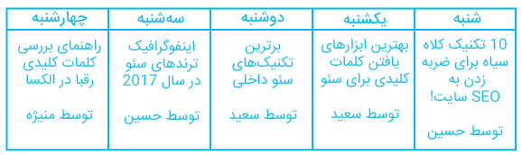 آغاز به موقع کار با تقویم تولید محتوا از ایجاد محتوای بد جلوگیری می کند و باعث صرفه جویی در زمان میشود. شما میتوانید تقویم تحریریه یا تقویم تولید محتوای خود را ایجاد کنید و بر اساس آن نیازهای خود را مرتفع سازید. به خاطر داشته باشید که تقویم تحریریه یک سند زنده است و در طول دوره های مختلف ممکن است به تغییر نیاز داشته باشد.